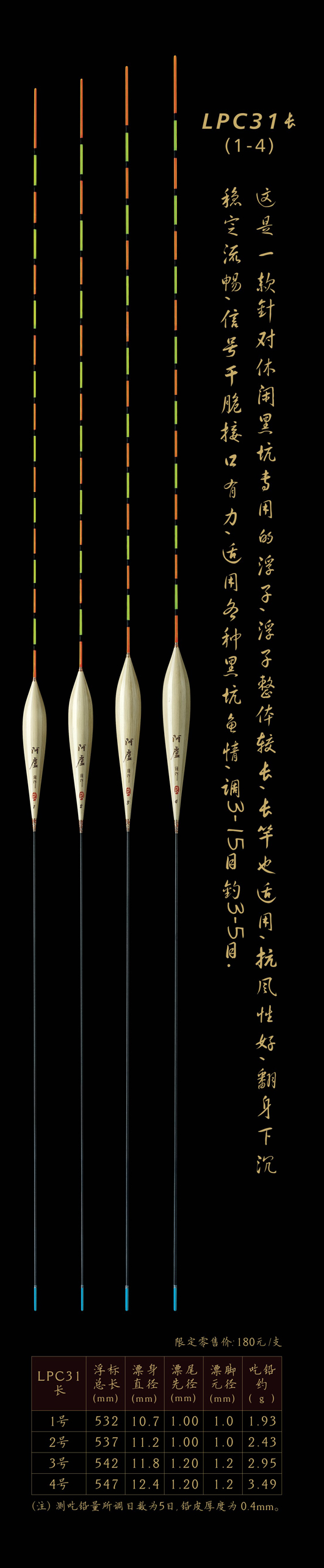 LPC31長(zhǎng):是一款針對(duì)休閑黑坑專用的浮子,浮子整體較長(zhǎng),長(zhǎng)竿也適用,抗風(fēng)性好,翻身下沉穩(wěn)定流暢,信號(hào)干脆接口有力,適用各種黑坑魚(yú)情,調(diào)3—15目,釣3—5目。