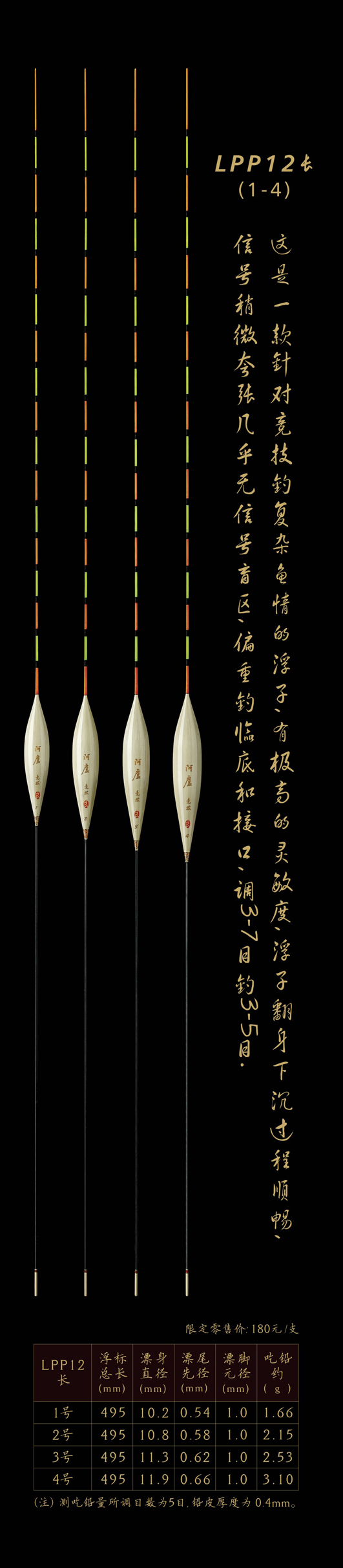 LPP12長(zhǎng):這是一款針對(duì)競(jìng)技釣復(fù)雜魚(yú)情的浮子,有極高的靈敏度,浮子翻身下沉過(guò)程順暢,信號(hào)稍微夸張幾乎無(wú)信號(hào)盲區(qū),偏重釣臨底和接口,調(diào)3—7目,釣3—5目。