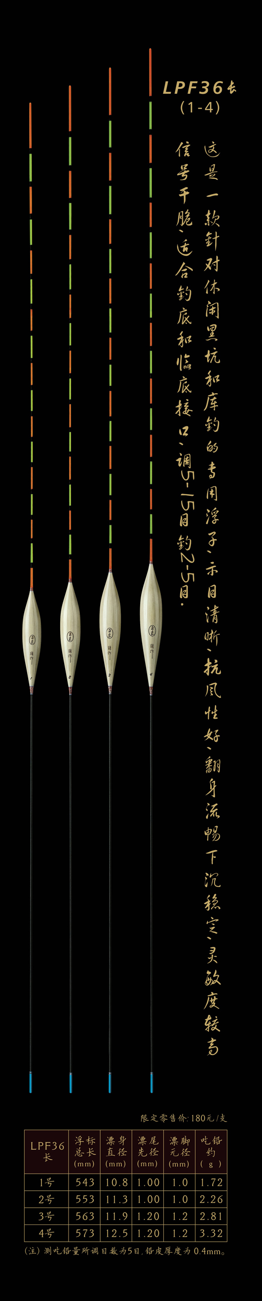 LPF36長(zhǎng):這是一款針對(duì)休閑黑坑和庫(kù)釣的專用浮子,示目清晰,抗風(fēng)性好,翻身流暢下沉穩(wěn)定,靈敏度較高信號(hào)干脆,適合釣底和臨底接口,調(diào)5—15目,釣2—5目.